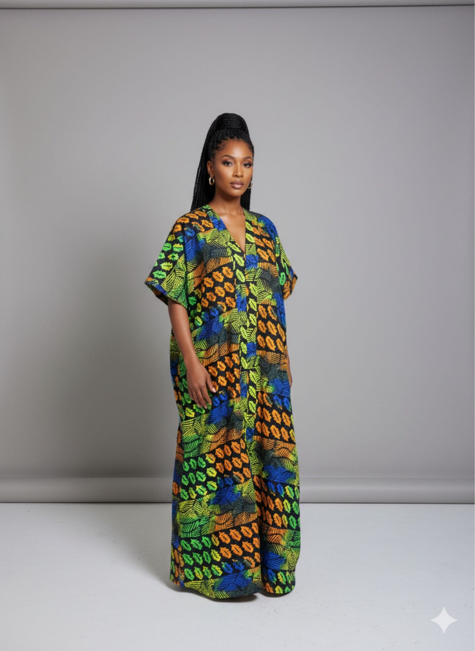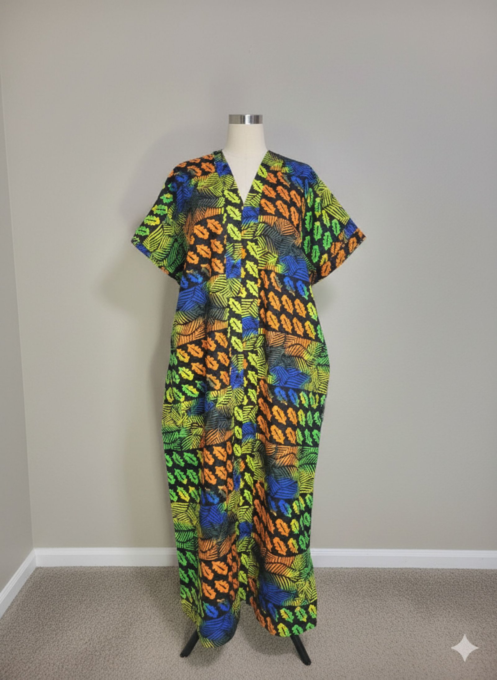 Adorn yourself in this stylish wax print maxi dress, a true celebration of authentic African artistry. This free size garment drapes beautifully, designed to flatter every body type and provide ultimate comfort. Each unique African wax print pattern tells a vibrant story, making this more than just a dress—it’s a wearable piece of cultural heritage. Perfect for any occasion, it effortlessly combines traditional elegance with modern style at TeeKay Collections.